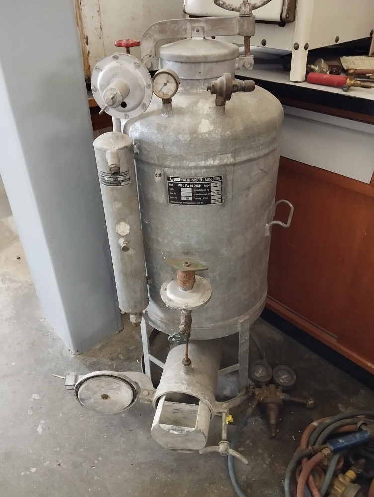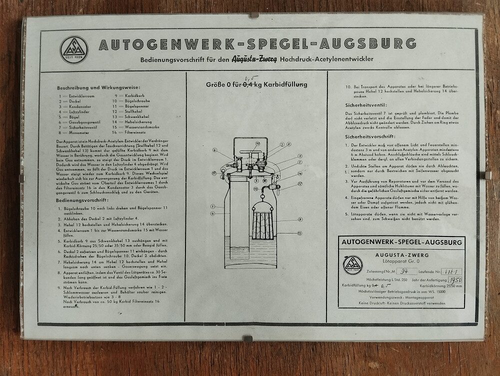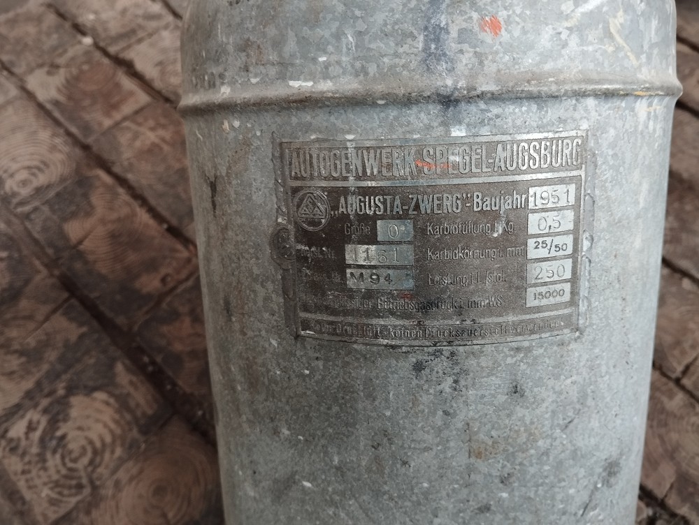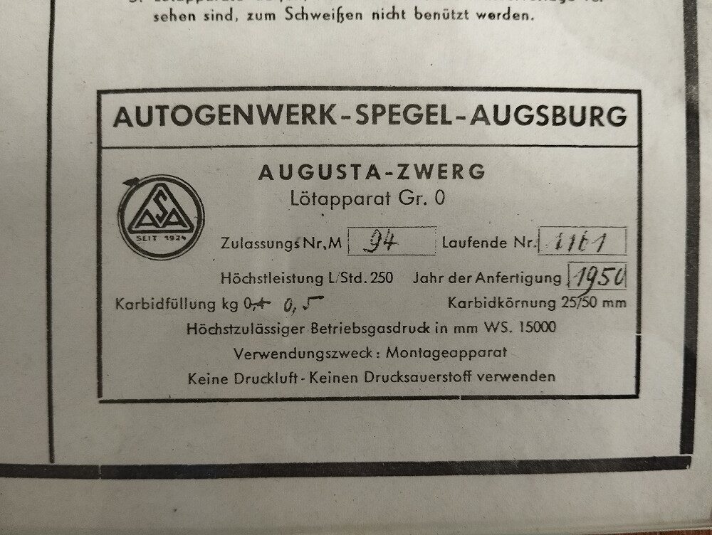 Vom Autogenwerk Spegel in Augsburg (ASA) haben wir einen „Augusta Zwerg“ zum Löten für bis zu 0,5 kg Karbid von 1951.