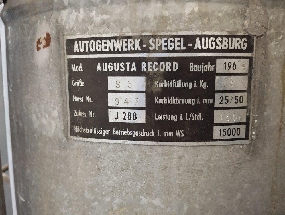 Vom Autogenwerk Spegel in Augsburg (ASA) haben wir einen „Augusta Record“ für bis zu 3 kg Karbid von 1964.