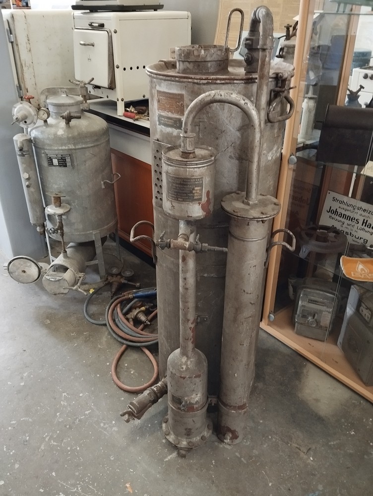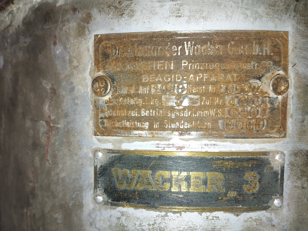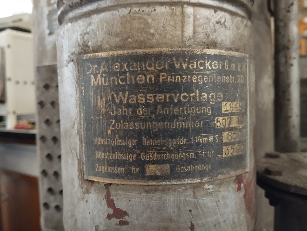 Von Alexander Wacker GmbH habe wir einen Wacker „3“ mit Wasservorlage für bis zu 3 kg Karbid von 1948.