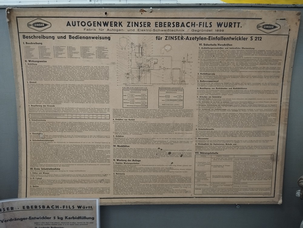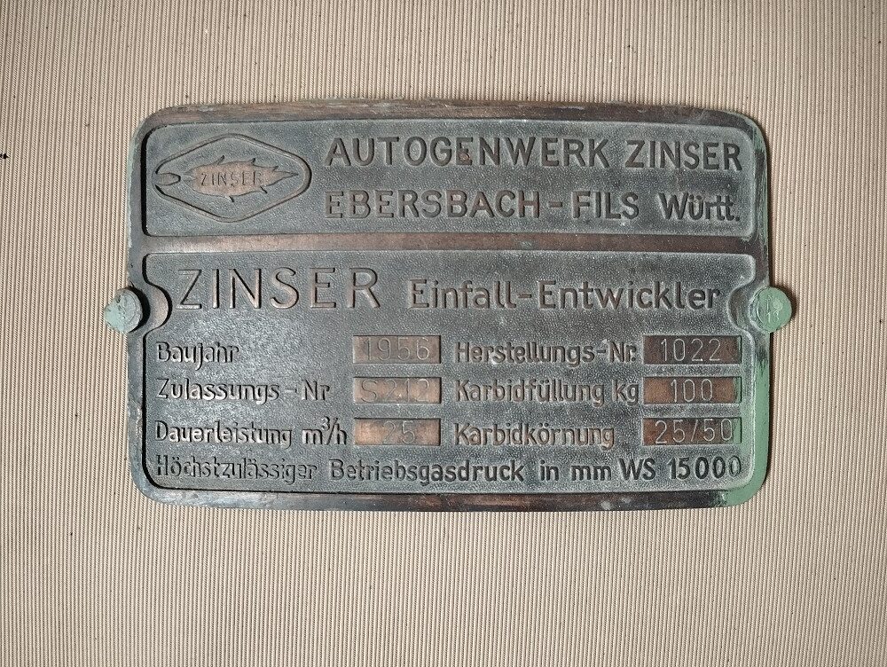 Vom Autogenwerk Zinser Ebersbach-Fils Württemberg haben wir eine Anleitung und ein Typenschild für einen Zinser Azetylen-Einfallentwickler S 212 Baujahr 1956.